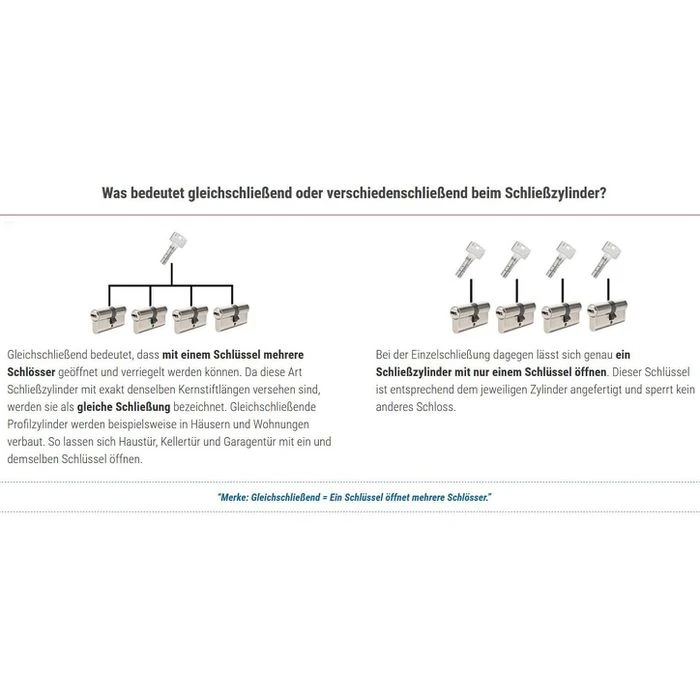Hinweis: Bei einer Bestellung mehrerer gleichschließender Zylinder der Abus Vitess 1000, werden alle mit der gleichen Schließung versehen. Bei einzelnen Bestellungen sind nur jeweils die Sets in sich gleichschließend. Die individuelle Schließungsnummer ist auf der mitgelieferten Codekarte hinterlegt. Mit dieser individuellen Nummer und Schließung können auch entsprechende gleichschließende Artikel bestellt werden, die jedoch als Sonderanfertigung zu bewerten und anzufragen sind.