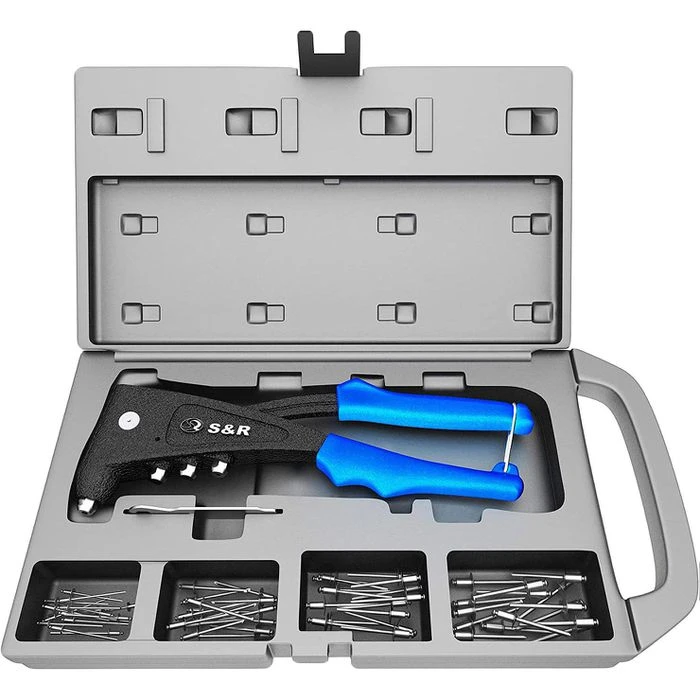 sonstiges: Blindnietzange mit Montageschlüssel für die 4 Mundstücke, Koffer mit 60 Aluminiumnieten zu je 15 Stück – 2,4 / 3,0/3,2 / 4,0 / 4,8/5,0 mm, eingebaute Rückholfeder für leichte Bedienung
